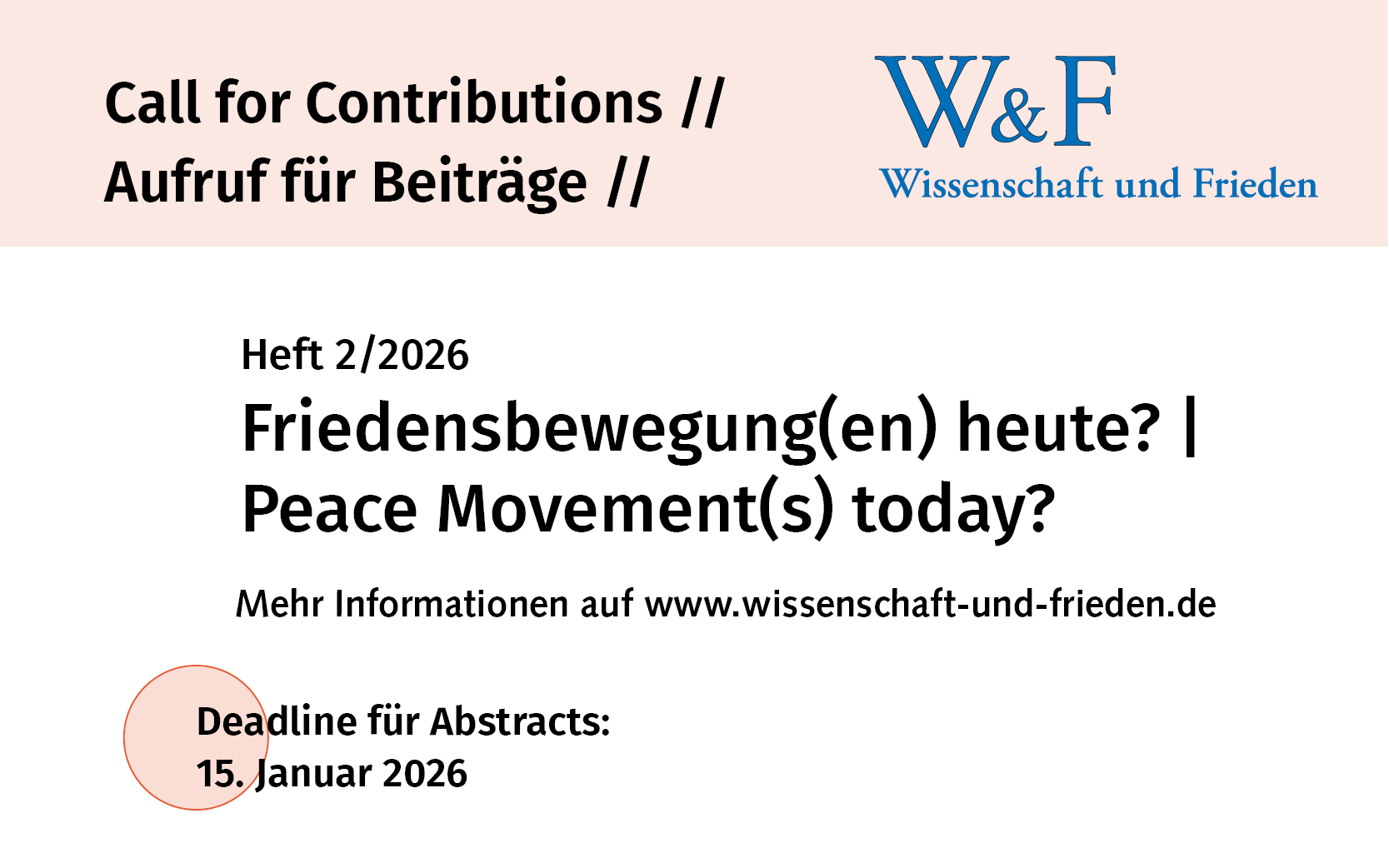 Beiträge zum Themenheft »Friedensbewegung(en) heute?« können sich mit einer der möglichen Fragestellungen (nicht abschließende Liste) beschäftigen. Alle Beiträge sollen auf einem Fall- bzw. Kontextbeispiel aus der Praxis der Friedensbewegung(en) aufbauen, oder globale Betrachtungen sein.